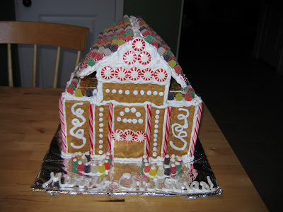 I went easy with Graham crackers - about 3 boxes for that size house. And get a good amount of candy to decorate how you would like, just glue on with the frosting! Use any extra frosting to cover up any mistakes and to make look extra snowy around the edges!